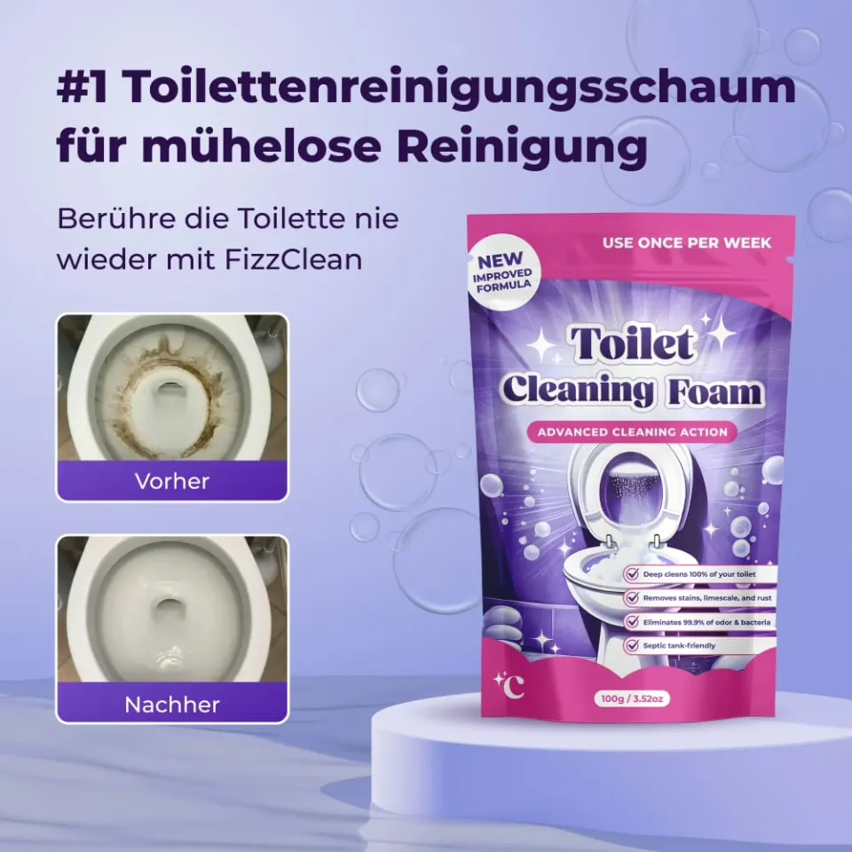 FizzClean Toilettenreinigungsschaum ist eine leistungsstarke, schnell wirkende Lösung für eine einfache und gründliche Toilettenreinigung. Die innovative Schaumtechnologie löst Flecken, Kalkablagerungen und geruchsverursachende Rückstände ganz ohne Schrubben.